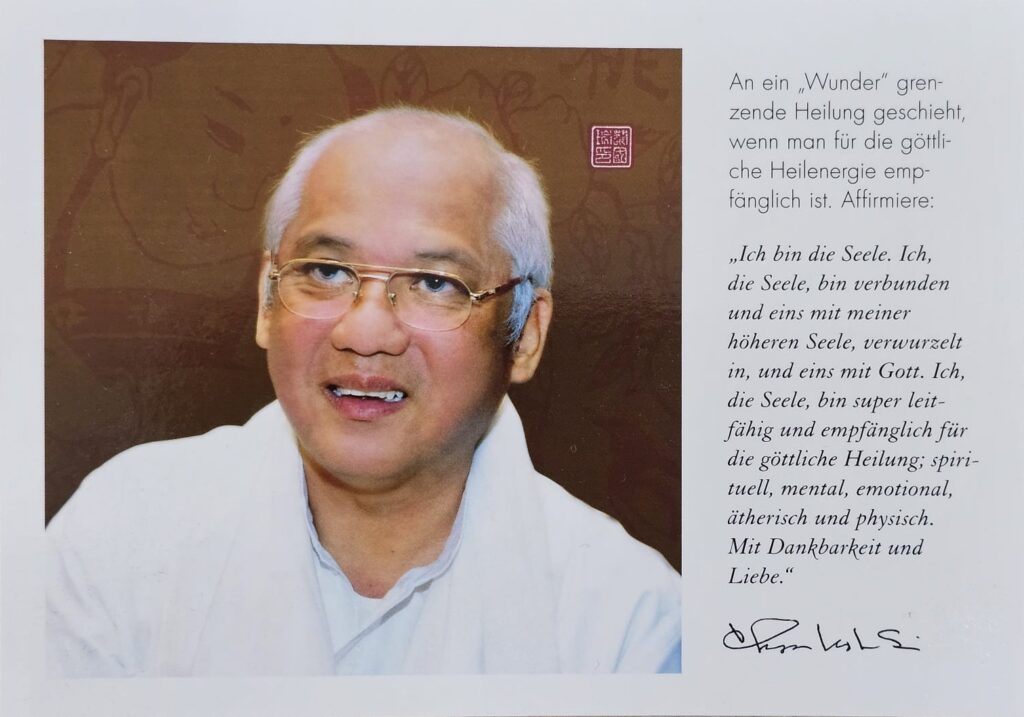 Gerade jetzt, in dieser Zeit der Wunder, passt die Affirmation von Grandmaster Choa Kok Sui auf dieser Karte besonders gut: eine Einladung zu Dankbarkeit, Liebe und göttlicher Heilenergie.